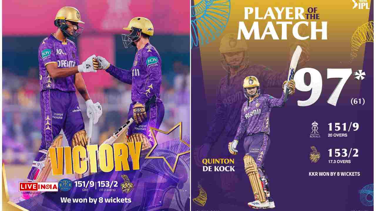 Chasing a modest target of 152, de Kock anchored the innings brilliantly, powering KKR to 153/2 in just 17.3 overs. With this win, KKR registered their first points of the season, while RR slumped to their second consecutive defeat.