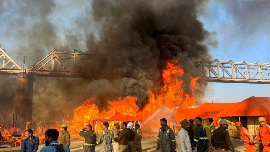 January 19, 2025: A fire broke out at the Maha Kumbh Mela in Prayagraj on Sunday following a cylinder blast. According to Pramod Sharma, the Chief Fire Officer for the Kumbh Mela, the explosion of two LPG cylinders in Sector 19 led to a massive fire that engulfed 18 tents. Thankfully, no casualties have been reported at this time.
