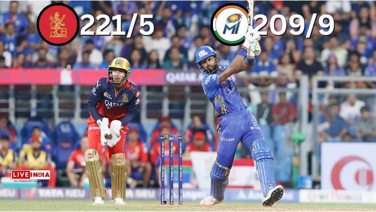 RCB, led by Rajat Patidar, put up a massive total of 221/5, which proved just out of reach despite a spirited fightback from Tilak Varma (56) and Hardik Pandya (42). The loss marks MI’s first home defeat to RCB in over a decade, and their fourth defeat of the season.