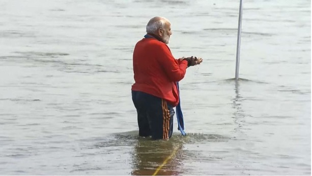 “Prime Minister Modi joins lakhs of devotees at the Triveni Sangam in Prayagraj, offering prayers and taking a holy dip at the world’s largest spiritual gathering.”