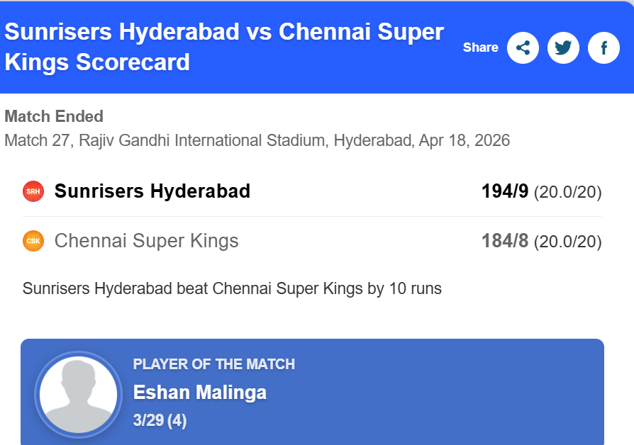 Despite losing wickets at regular intervals in the later stages, SRH managed to finish with a competitive total of 194/9 in 20 overs, a score that ultimately tested CSK’s batting depth.