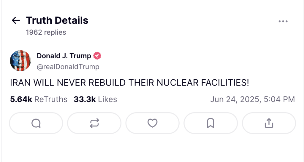 Washington [US], June 25 — In a dramatic assertion following the recent US-led airstrikes on Iranian nuclear facilities under Operation Midnight Hammer, President Donald Trump declared that Iran “will never be able to rebuild” its bombed-out sites, including the hardened installations at Fordow, Natanz, and Esfahan. Trump posted on Truth Social, stating unequivocally, “IRAN WILL NEVER REBUILD THEIR NUCLEAR FACILITIES!” — signaling a turning point in the military and diplomatic standoff that has rattled the Middle East.