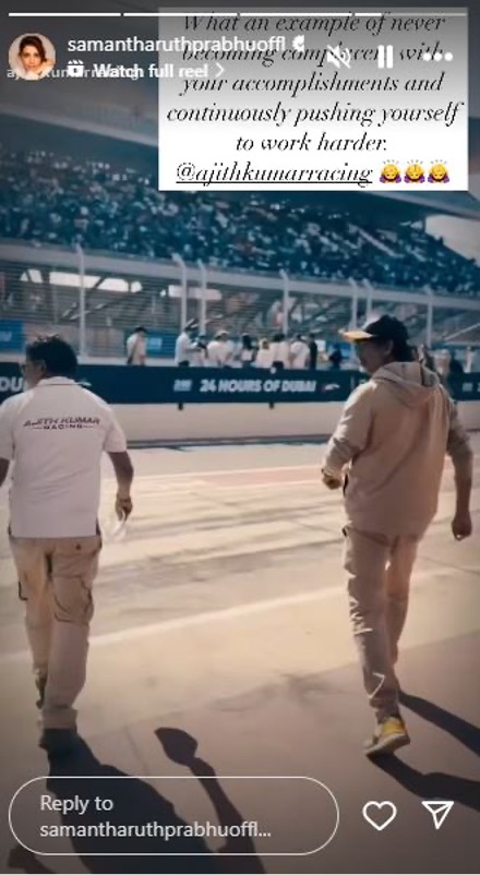Samantha shared a celebratory video of Ajith on her Instagram Stories, adding, “What an example of never becoming complacent with your accomplishments and continuously pushing yourself to work harder.”