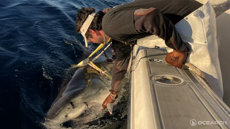 While Contender is the largest male white shark tagged by OCEARCH in the Atlantic, a massive 17-foot-2-inch female white shark named Nukumi holds the title as the largest specimen OCEARCH has ever tagged and released. Nukumi, named after a Native American mythological figure, was first tagged off Lunenburg, Nova Scotia, in October 2020 and weighed an astounding 3,541 pounds. Her last ping was recorded in 2021.